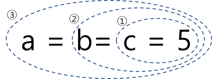 대입 연산자는 연산자 중에서 가장 낮은 연산자 순위를 가지고 있다. 그러므로 제일 마지막에 수행이 된다. 또한, 연산의 진행방향은 오른쪽에서 왼쪽으로 진행하므로 a = b= c= 5; 는 다음 순서로 연산된다.