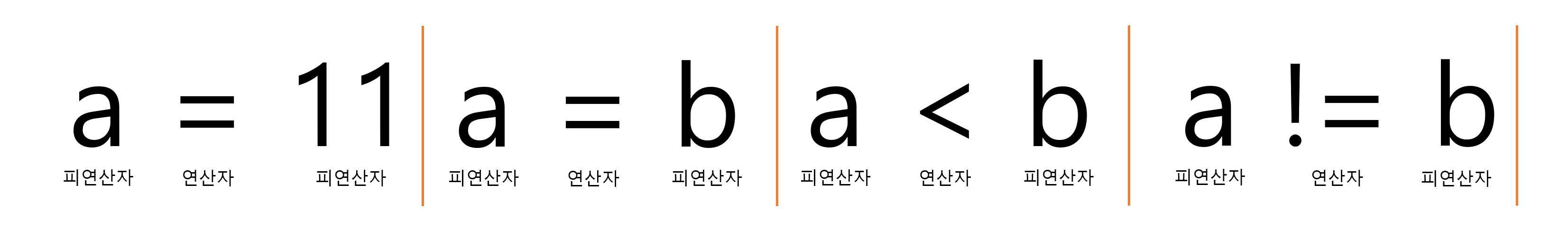 | 이항 연산자 | 피연산자가 두 개 존재 | ex) a = 11, a= b, a <b, a !=b |