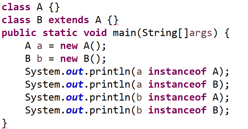 위와 같이 실행했을때는 2번째만 false가 나오고 나머지는 true가 나오는 것을 확인할 수 있다. 이는 B 클래스가 자식 클래스로서 A 클래스내에 들어가 있는 구성요소는 포함하지만, B 클래스에 들어가 있는 것은 A에는 없기 때문에 나타난 결과이다.
