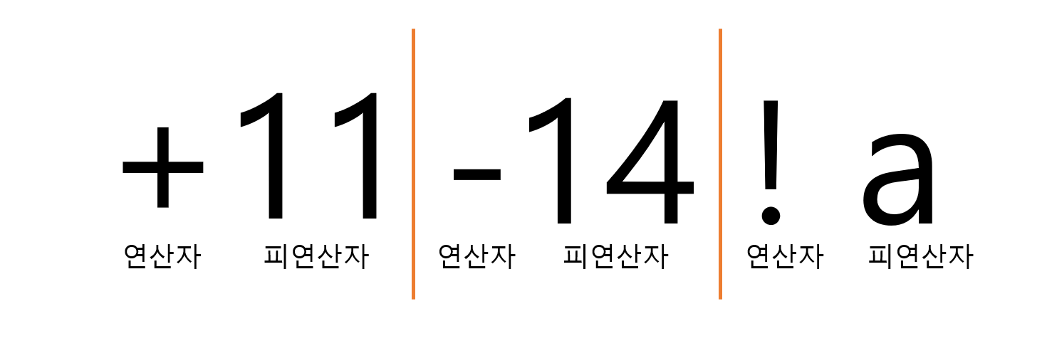 | 단항 연산자 | 피연산자가 하나만 존재 | ex) +11, -14, !a |