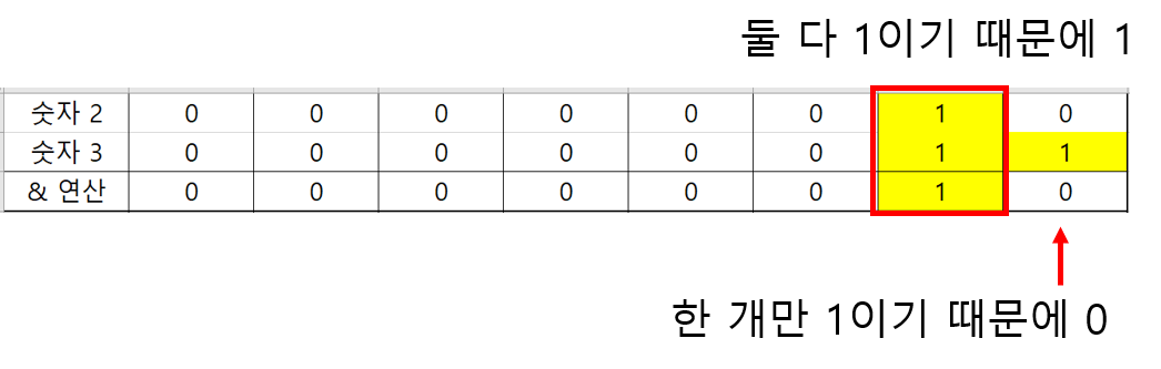위의 그림처럼 &연산자는 둘다 1일 경우에만 1이된다. 즉 0이 하나라도 존재하면 0으로 출력된다. 그 결과 노란색으로 표시된 부분에 집중하면 된다. & 연산 결과는 10인것으로 볼 수 있다. 이를 10진법으로 변환하면 숫자 2이므로, 실행결과가 2로 나오게 된다.