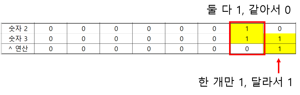 | ^ | XOR 연산 | a^b | a 와 b가 같지 않으면 1 |