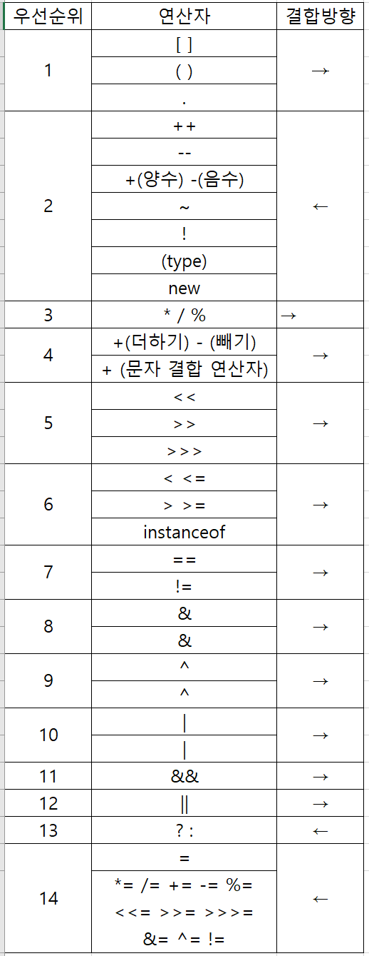우선 순위의 경우 표를 이용하여 참고하면 쉽게 이해할 수 있다.