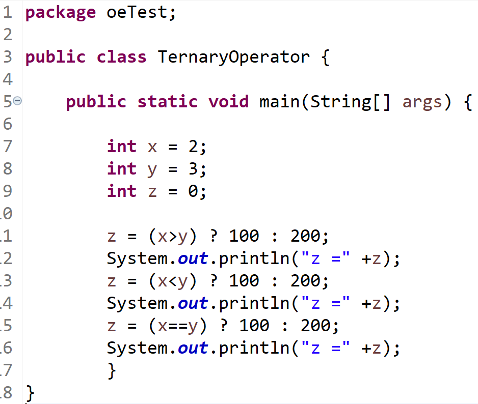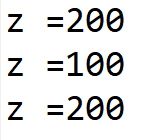 3) z에 x가 y를 비교한 값을 대입한다. 이때, x와 y가 같을 경우 (=참이면) 100을 출력, 다를 경우 (=거짓이면) 200을 출력하는 연산자이다. 세 번째의 경우 거짓이기 때문에 200이 출력되었다. x = 2, y = 3이다.