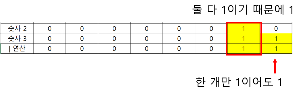 | | | OR 연산 | a|b | a 와 b 둘중에 하나라도 1이면 1 |