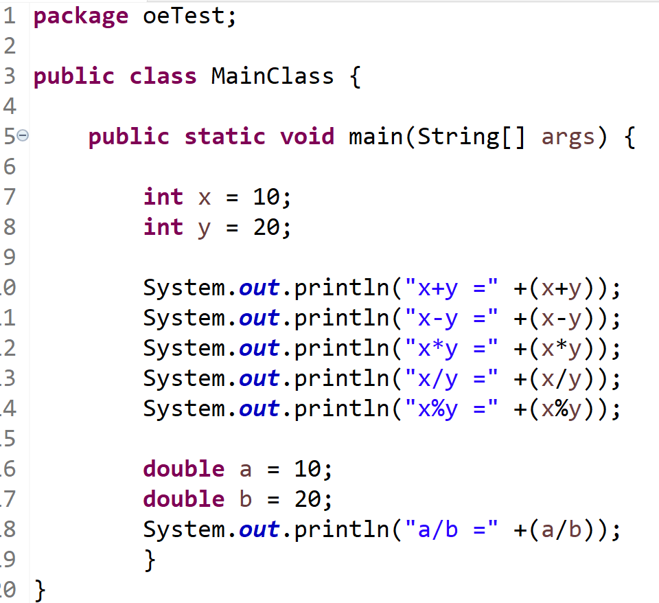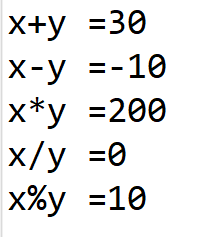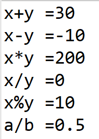 해당 사칙연산은 기본적인건 이해가 되나, 네 번째 사칙연산인 "x/y"의 값이 소수점이 나오지 않고, 0으로 나온 점을 주목해야 한다. 이는 x에 int형만 들어갈 수 있기 때문이다. 만약 소수점을 보고 싶다면, x와 이를 함께 연산하는 y의 자료형을 double로 지정하는 등 형변환이 일어나야 한다. 상세한 예시는 다음과 같다.