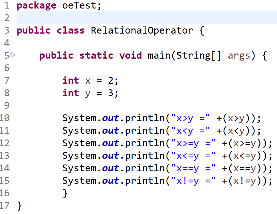 관계 연산자는 두개의 피연산자를 비교해서 참과 거짓을 도출할 경우에 사용한다. 피연산자란 연산자가 아닌 것. 즉 연산이 되는 대상을 일컫으며, 예제에서 사용하던 x와 y가 이에 해당된다. 관계 연산자는 다음의 기호들이 사용된다.